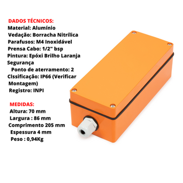 A vedação emborrachada nitrílica permite uma vedação perfeita para atender IP 66, protegendo o interior da caixa contra poeira e jatos potentes de água provenientes de qualquer direção. Os parafusos em aço inoxidável são imunes à oxidação, garantindo a integridade do produto mesmo em condições adversas. Além disso, a rosca do prensa cabo de 1/2" bsp padrão para instalações elétricas e o prensa cabo de pvc incluso no produto facilitam a instalação e garantem a segurança do sistema elétrico. Adquira já a sua Botoeira Metálica de Alumínio e garanta qualidade e eficiência para a sua caixa elétrica.
